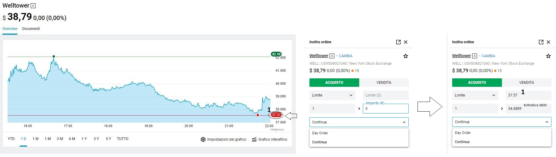 Nell'immagine seguente abbiamo un esempio di ordine limite di acquisto; questo significa che quando (e se!) il prezzo ritornerà al valore 37.57$ scatterà l'ordine di acquisto di 1 quantità, perché secondo la nostra strategia da quel momento in poi le quotazioni potrebbero iniziare a risalire.