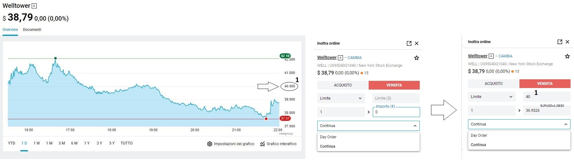 In questo caso, supponendo di aver comprato precedentemente l'azione WellTower di 1 quantità, se il prezzo dovesse raggiungere il valore di 40$, scatterà l'ordine di vendita di 1 azione, perché secondo la nostra strategia da quel momento in poi il prezzo potrebbe scendere. Relativamente alla durata, sia per gli ordini limiti che per gli ordini stop, è possibile specificare per quanto tempo deve essere valido un ordine. Nel caso di "Day Order" significa che l'ordine verrà chiuso in giornata, nel caso invece di "Continua" la durata dell'ordine si prolungherà anche nei giorni successivi a quello odierno. Ipotizziamo adesso di voler aggiungere uno Stop Loss su una posizione long di un titolo precedentemente acquistato: