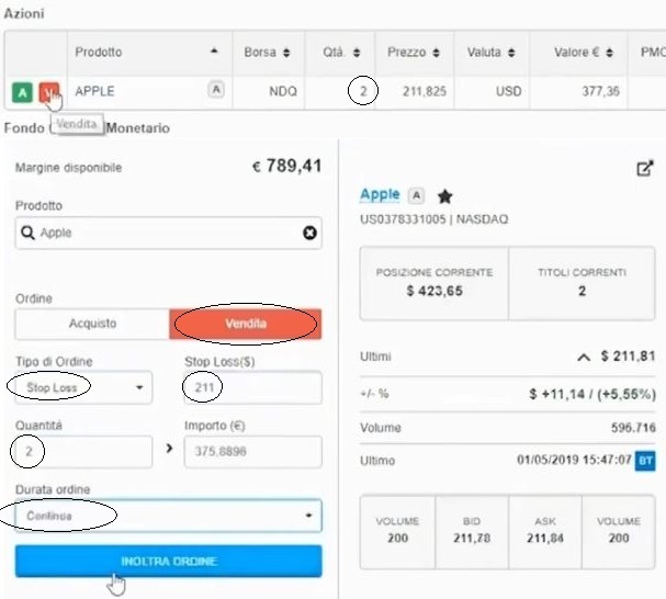 Desideriamo chiudere interamente la posizione (2 azioni) al raggiungimento del prezzo di 211$. Scegliendo come durata dell'ordine "Continua" lo Stop Loss rimarrà attivo fino a quando il prezzo di Apple non scenderà fino al valore di 211$.